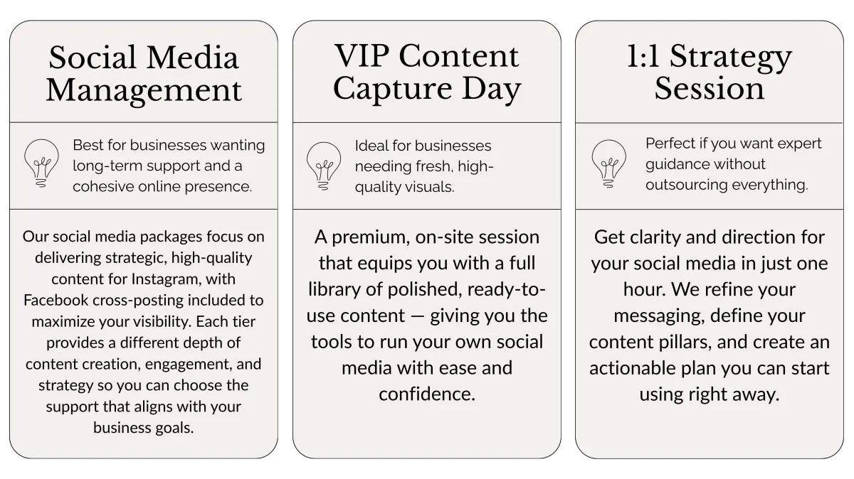 Full-service social media management that includes strategy, content creation, posting, and ongoing account support.